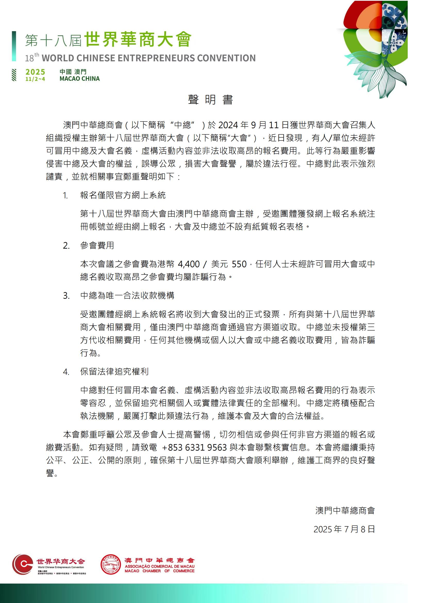 澳門中華總商會(以下簡稱“中總”)於2024年9月11日獲世界華商大會召集人組織授權主辦第十八屆世界華商大會(以下簡稱“大會”),近日發現,有人/單位未經許可冒用中總及大會名義,虛構活動內容並非法收取高昂的報名費用。此等行為嚴重影響侵害中總及大會的權益,誤導公眾,損害大會聲譽,屬於違法行徑。中總對此表示強烈譴責,並就相關事宜鄭重聲明如下:
